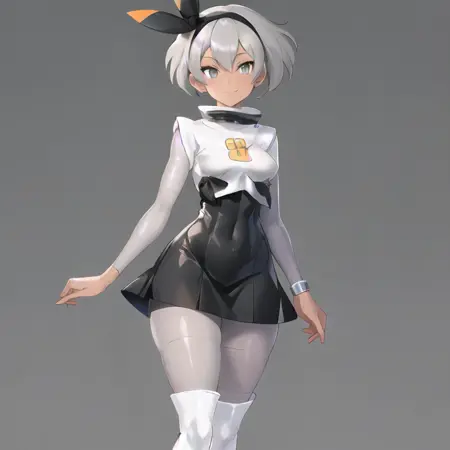 Clothing: uniform, dress, short dress, boots, grey boots, knee boots, grey footwear, pantyhose, long sleeves, bodysuit under clothes, bodysuit, grey bodysuit, high collar