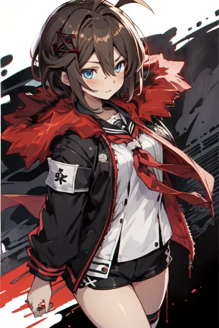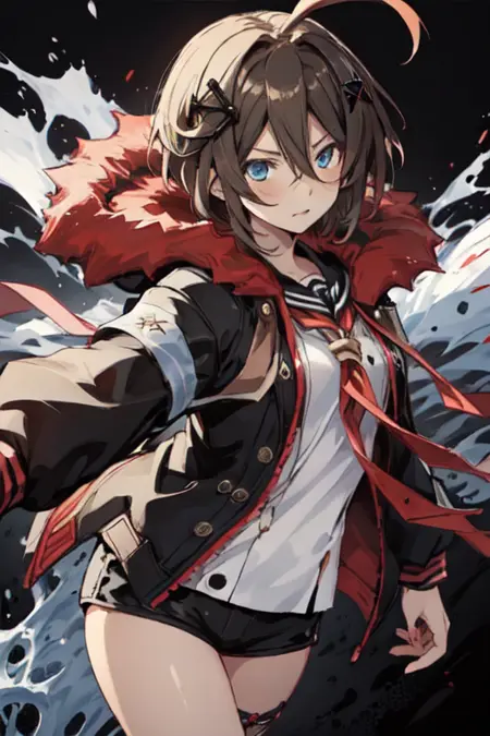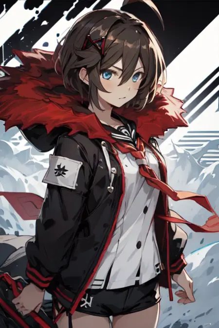 RedRidingHoodMS, 1girl, solo, short hair, blue eyes, brown hair, hair ornament, hair between eyes, black jacket, ahoge, shorts, hood, sailor collar, neckerchief, fur trim, short shorts, black shorts, armband,