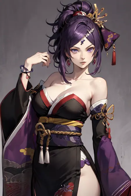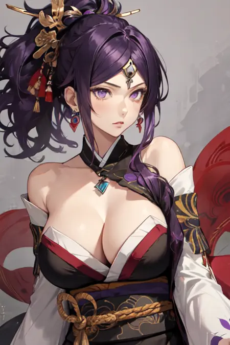 NohimeWarriors, 1girl, solo, large breasts, hair ornament, cleavage, bare shoulders, jewelry, purple eyes, purple hair, earrings, detached sleeves, japanese clothes, kimono,