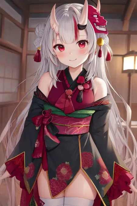 offical wear, japanese_clothes, kimono, weapon, white_thighhighs, bell, oni_mask, rope