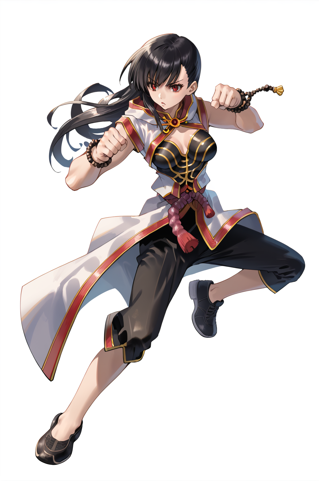 prompt: mnkRo, black capri pants, white coat, clothing cutout, strapless, bead bracelet, hooded coat, shoes
