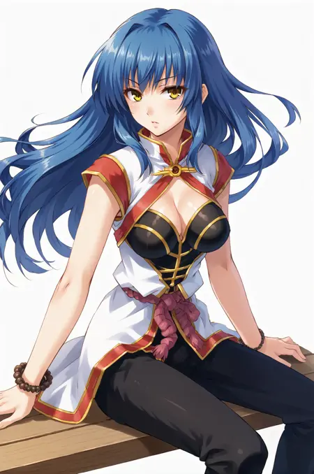 prompt: mnkRo, pants, cleavage cutout, bead bracelet, jewelry