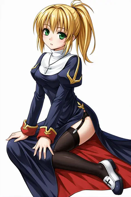 prompt : priestRO, long sleeves, pantyhose, garter belt, shoes, navy long dress, puffy sleeves, turtleneck, nun, necklace, cross necklace
