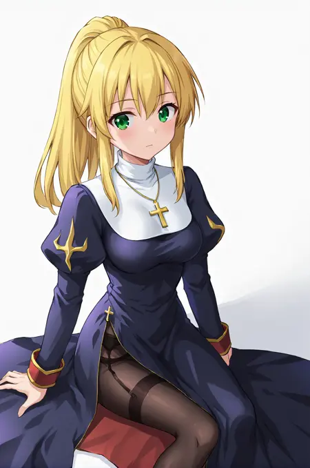 prompt : priestRO, long sleeves, pantyhose, garter belt, shoes, navy long dress, puffy sleeves, turtleneck, nun, necklace, cross necklace