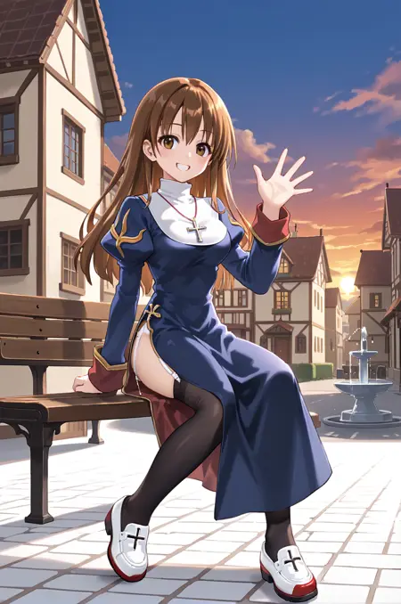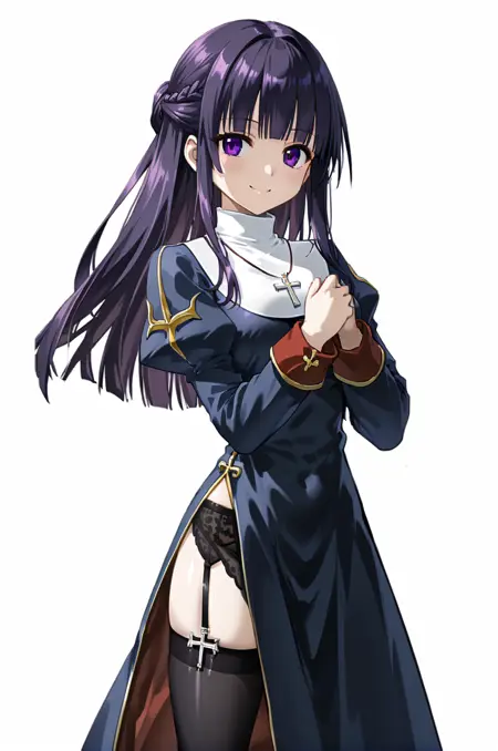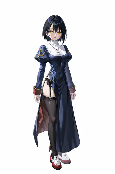 prompt: priestRO, black thighhighs, garter straps, garter belt, cross necklace, shoes, side slit, turtleneck, long dress, puffy sleeves, long sleeves, nun, shoes