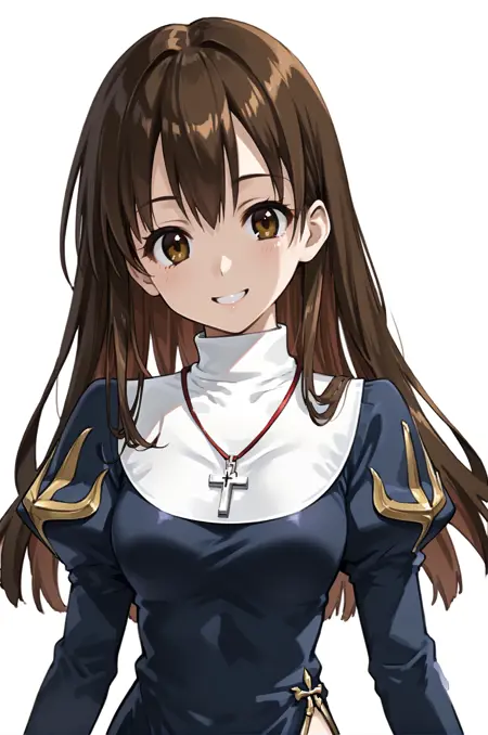prompt : priestRO, long sleeves, pantyhose, garter belt, shoes, navy long dress, puffy sleeves, turtleneck, nun, necklace, cross necklace