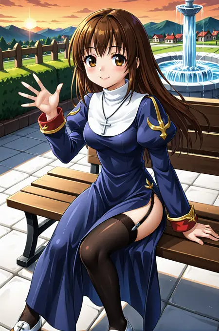 提示词:priestRO,长袖,连裤袜,吊袜带,鞋子,深蓝色长裙,蓬松袖子,高领,修女,项链,十字项链