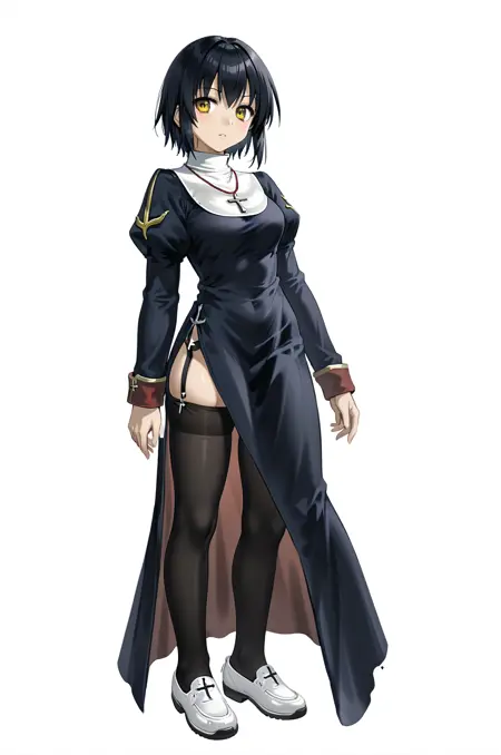 プロンプト:priestRO, ブラックのシンソックス, ガーターstrap, ガーターベルト, 十字架のネックレス, 靴, サイドスリット, チュニックネック, ロングドレス, パフスリーブ, ロングスリーブ, 女性修道女, 靴