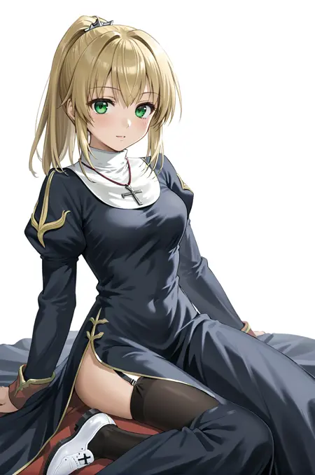 プロンプト:priestRO, ロングスリーブ, パンスト, ガーターベルト, ロングドレス, パフスリーブ, チュニックネック, 女性修道女, ネックレス, 十字架のネックレス