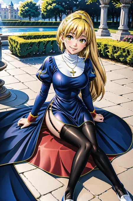 プロンプト:priestRO, ブラックのシンソックス, ガーターstrap, ガーターベルト, 十字架のネックレス, 靴, サイドスリット, チュニックネック, ロングドレス, パフスリーブ, ロングスリーブ, 女性修道女, 靴