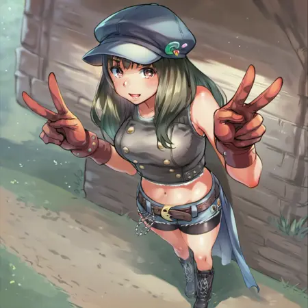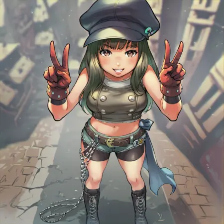 kyrie canaan, hat, long hair, straight hair, shorts, bike shorts under shorts, belt, crescent belt buckle, midriff, navel, gloves, boots, cross-laced footwear, sash, blue sash, chain, undershirt,