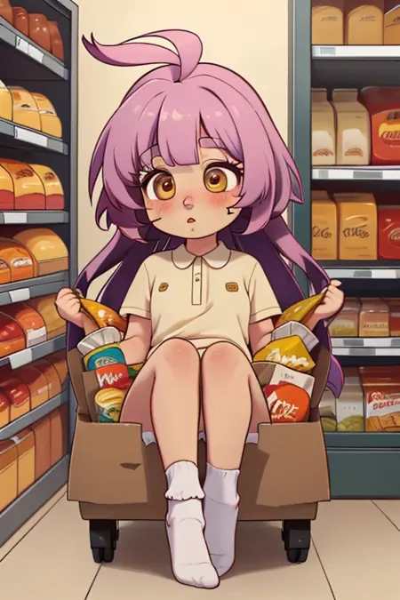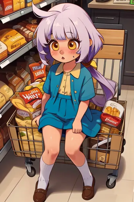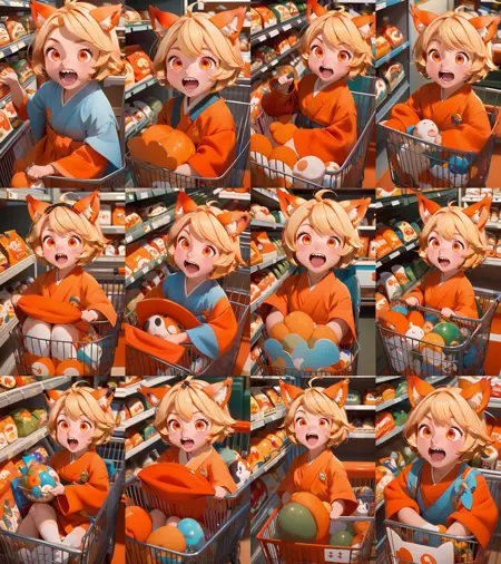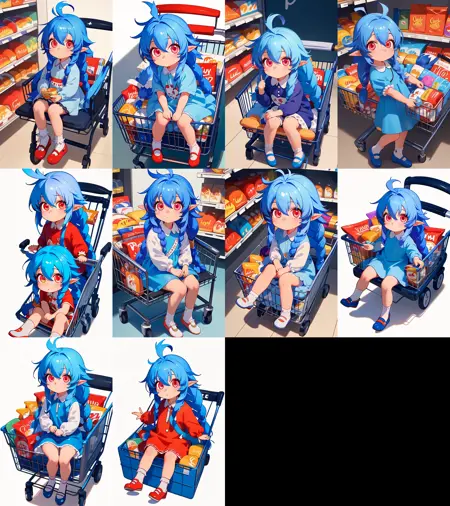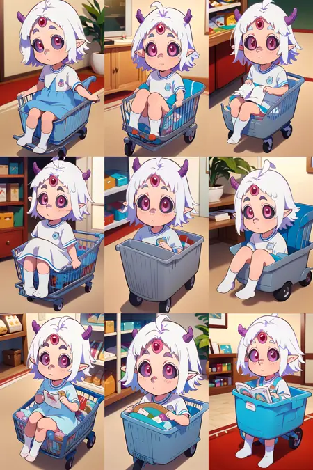 일반적으로, 캐릭터를 식료품 카트에 "넣는" 로어를 원했고, 이를 성공적으로 구현했습니다. 책장이나 진열대 위에 놓일 수 있고, 프롬프트에 없어도 바퀴 달린 의자로 생성할 수 있으며, 캐릭터가 포함된 프롬프트를 치비 버전으로 변환합니다.