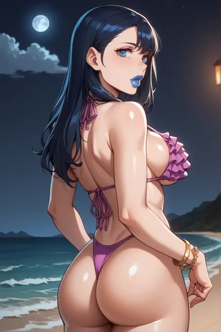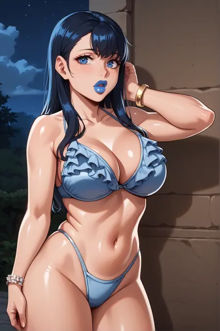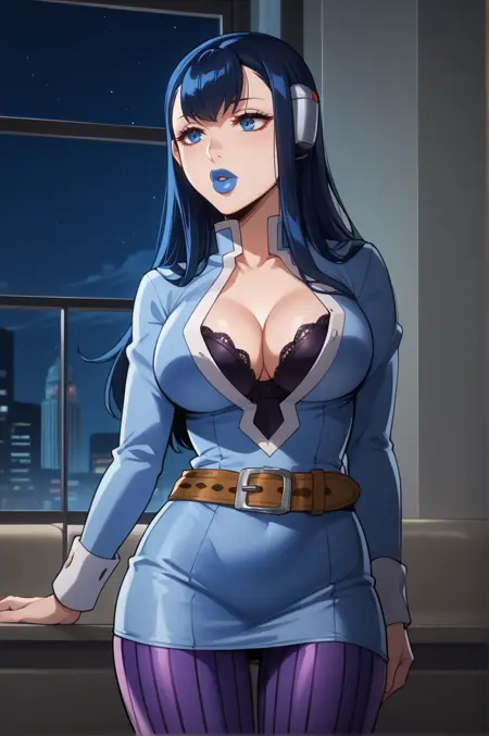 long hair, black hair, blue hair, blue eyes, makeup, blue lipstick, large breastsAttire