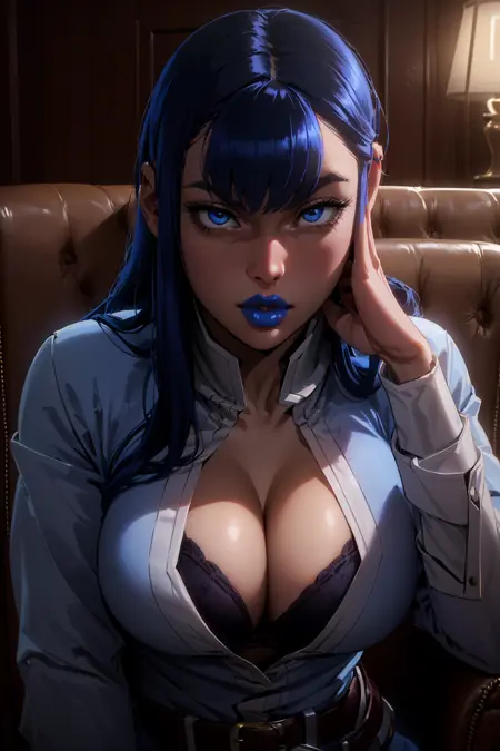 长发,黑发,蓝发,蓝眼睛,妆容,蓝色口红,大乳房服装