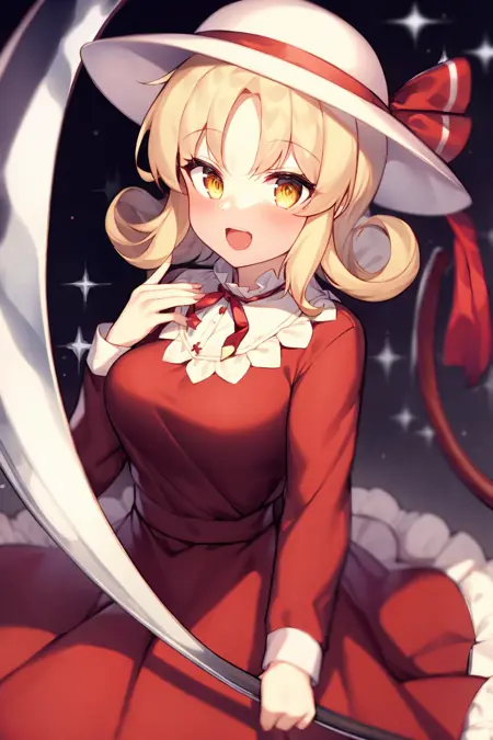 tag:1girl,hathat ribbon,curly hair,blonde hair, short hair,yellow eyes,ribbon,bow,red dress,long sleeves,