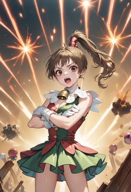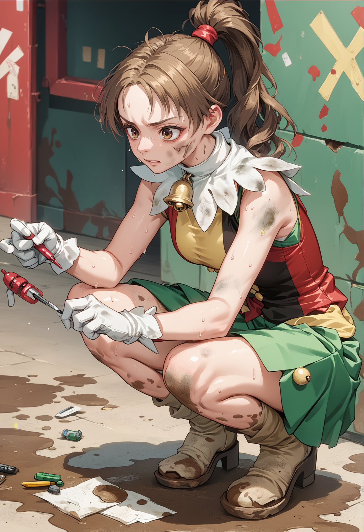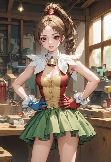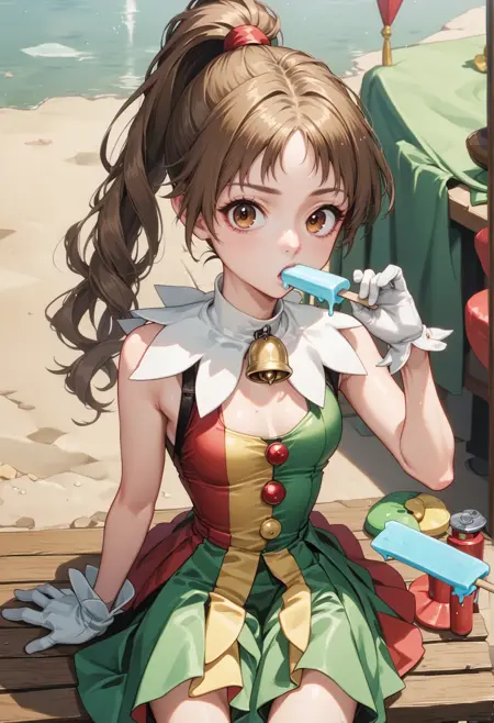 notable tags: brown hair, brown eyes, long hair, ponytail, jester costume, green skirt, white collar, bell chocker, gloves