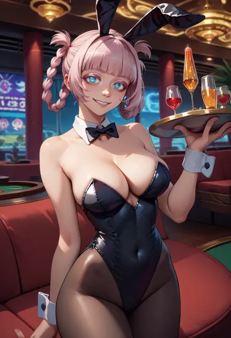 Trigger + Appearance: nanakusa nazuna, pink hair, braid, hair rings, ringed eyes