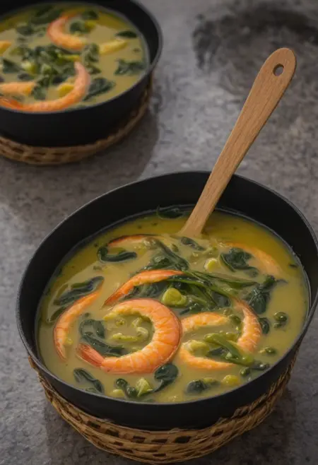 Tacacá (Brazilian Portuguese: [taka'ka]) is a typical dish of Northern Brazil (mostly consumed in Pará, Amazonas, Acre, Amapá and Roraima). It is made with jambu (a native variety of paracress), and tucupi (a broth made with wild manioc), cooked tapioca starch (“goma de tapioca” - manioc), as well as dried shrimps and fragrant, small yellow peppers known as “pimenta de cheiro”. It is traditionally served hot in a bowl made from an Amazonian gourd known as cuia. (Wikipedia)