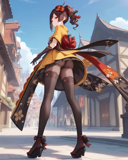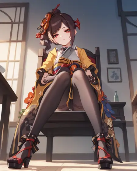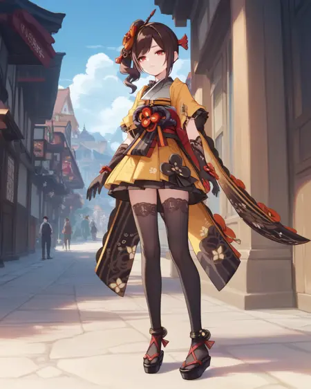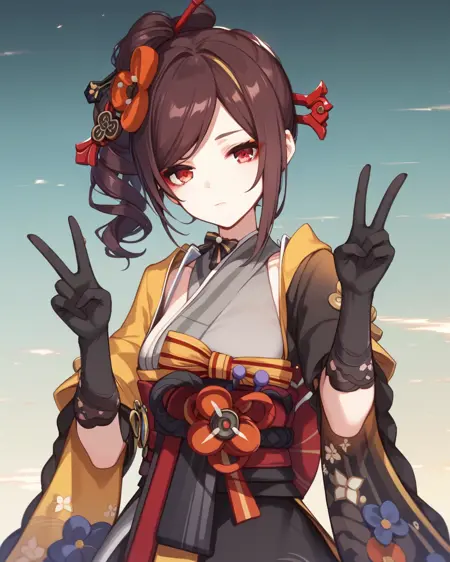 Base Prompt: chiori, 1girl, red eyes, brown hair, side ponytail, makeup, hair ornament,