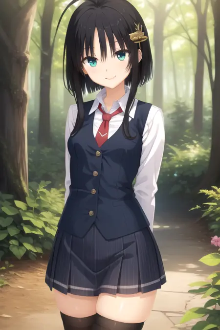 collarbone,blue vest,button,white shirt,collared shirt,red necktie,long sleeves,medium breasts,arms behind back,blue skirt,thigh strap,white thighhighs,loafers