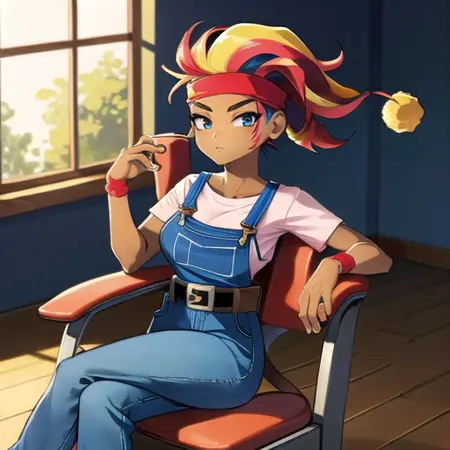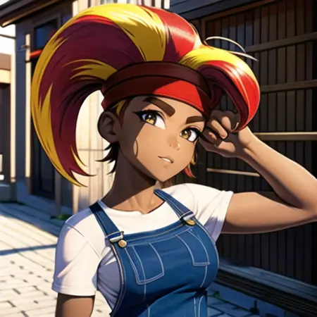 1. 1girl, medium breasts, side burns, multicolored hair, red hair, dark skinned female, large eyebrows. yellow hair, red bandanna, gwendolyn, furry female, fur body, monkey girl, animal tail, side burns, fur on face,