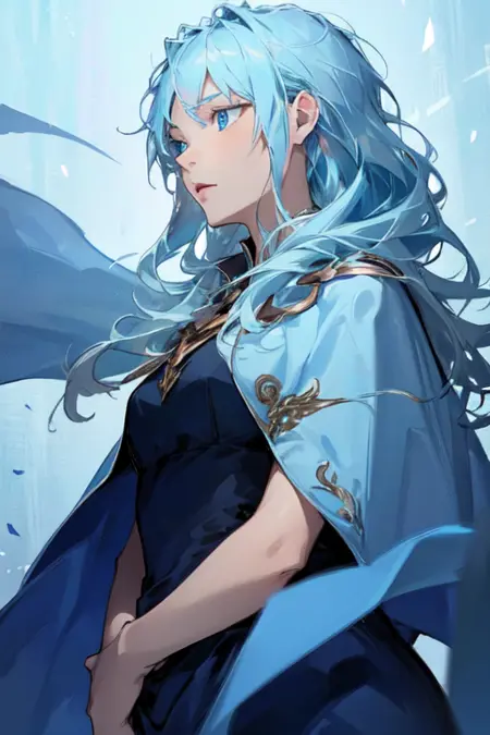 KhunMaschennyJahad, 1girl, solo, long hair, blue eyes, blue dress, light blue hair, blue cape,