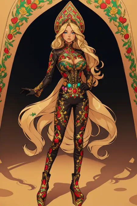 키워드: HUD_LG_911, 화려한 자수장식 가죽 헤드어스, 코르셋, 장갑, 긴 소매, 바디수트, 신발