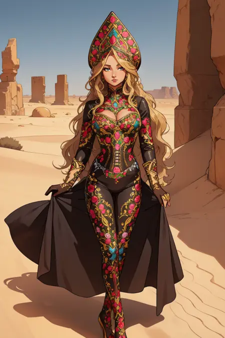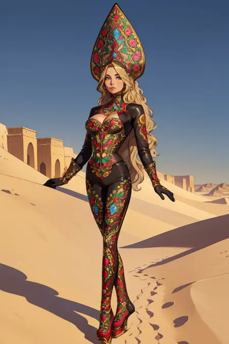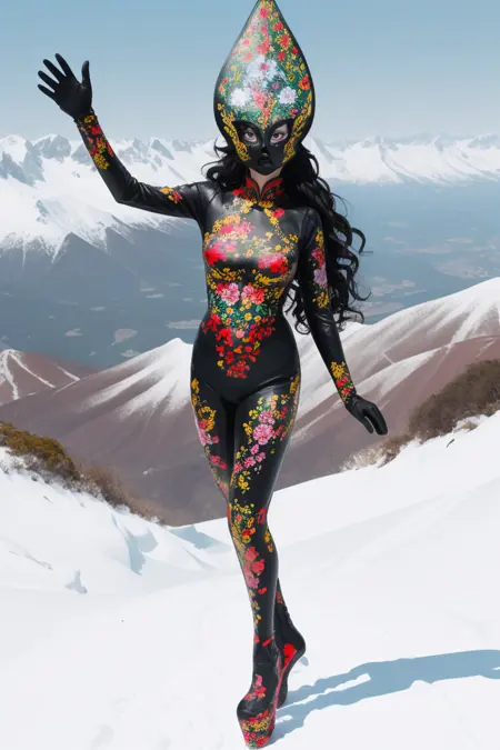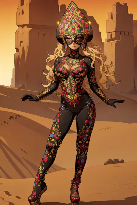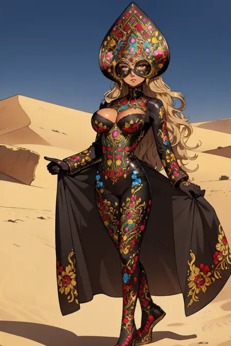 이 옷은 여러 부분으로 구성되어 있으며, 각 부분을 켜거나 끌 수 있으며, 가가의 옷장에서 특징적인 발뒤꿈치 없는 부츠가 포함되어 있습니다. 완전한 마스크를 착용하면 안구 부위의 메시를 잘 구성하기가 매우 어렵지만, 드물게 가능합니다. 향후 이 문제를 해결하여 업데이트해보려 합니다.