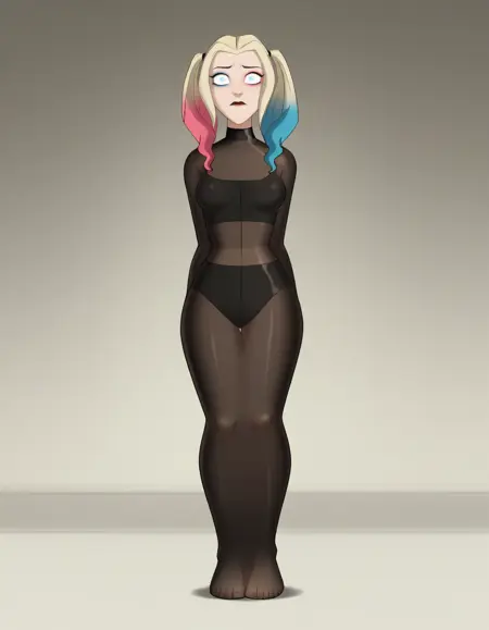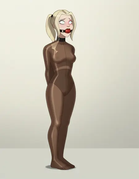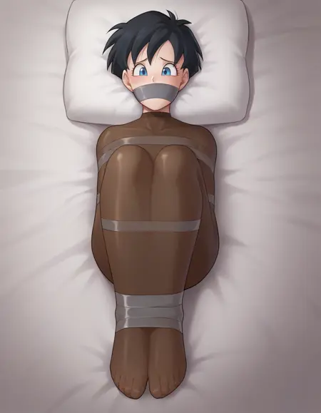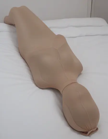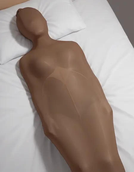 General Tags (use as needed): mummification \\(bound\\), restrained, encasement, pantyhose on head, pantyhose over face, flat hair, covered hair, arms at sides, arms behind back, arms in front, stretching cocoon, crossed arms, arms free, *see example images for more