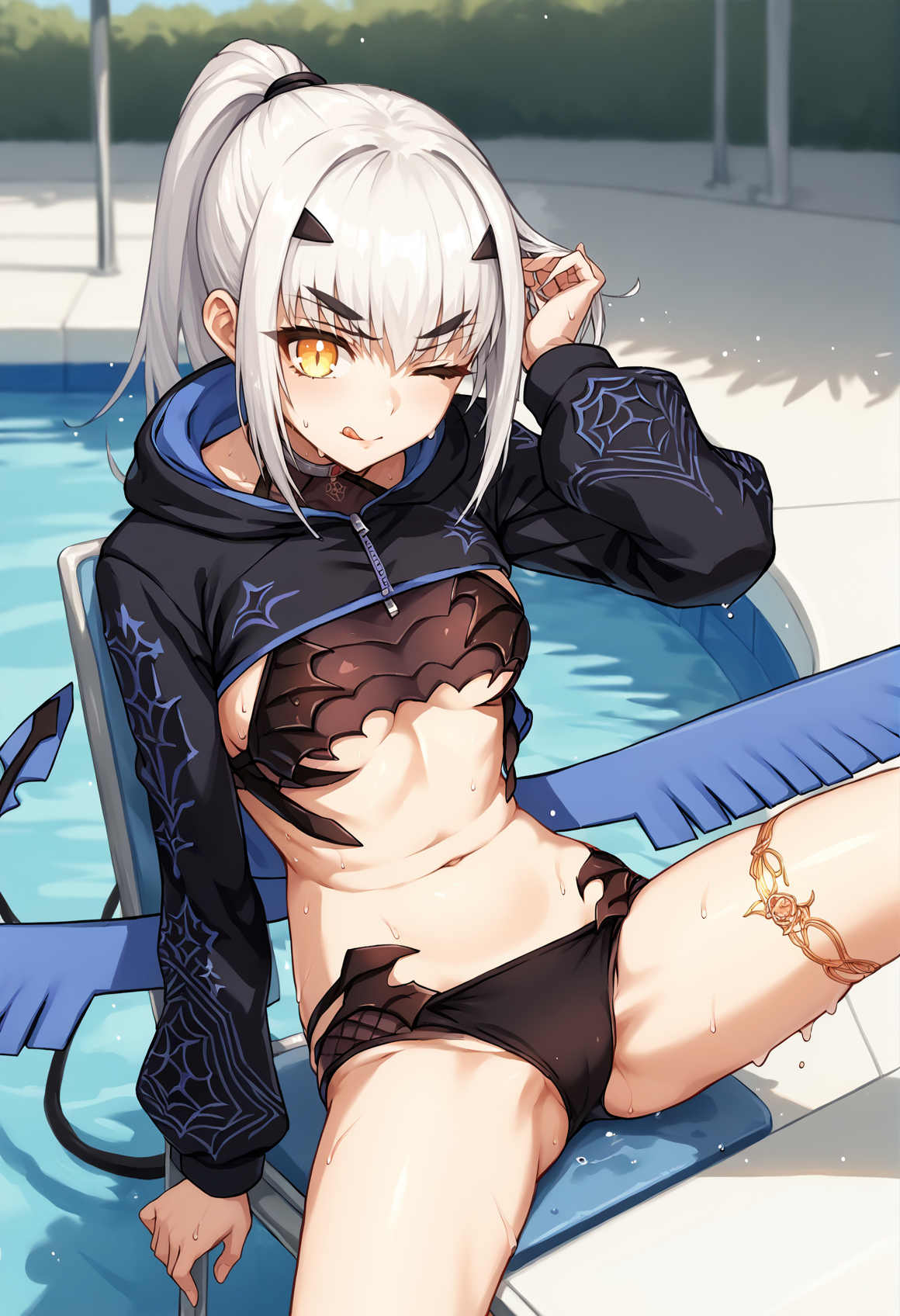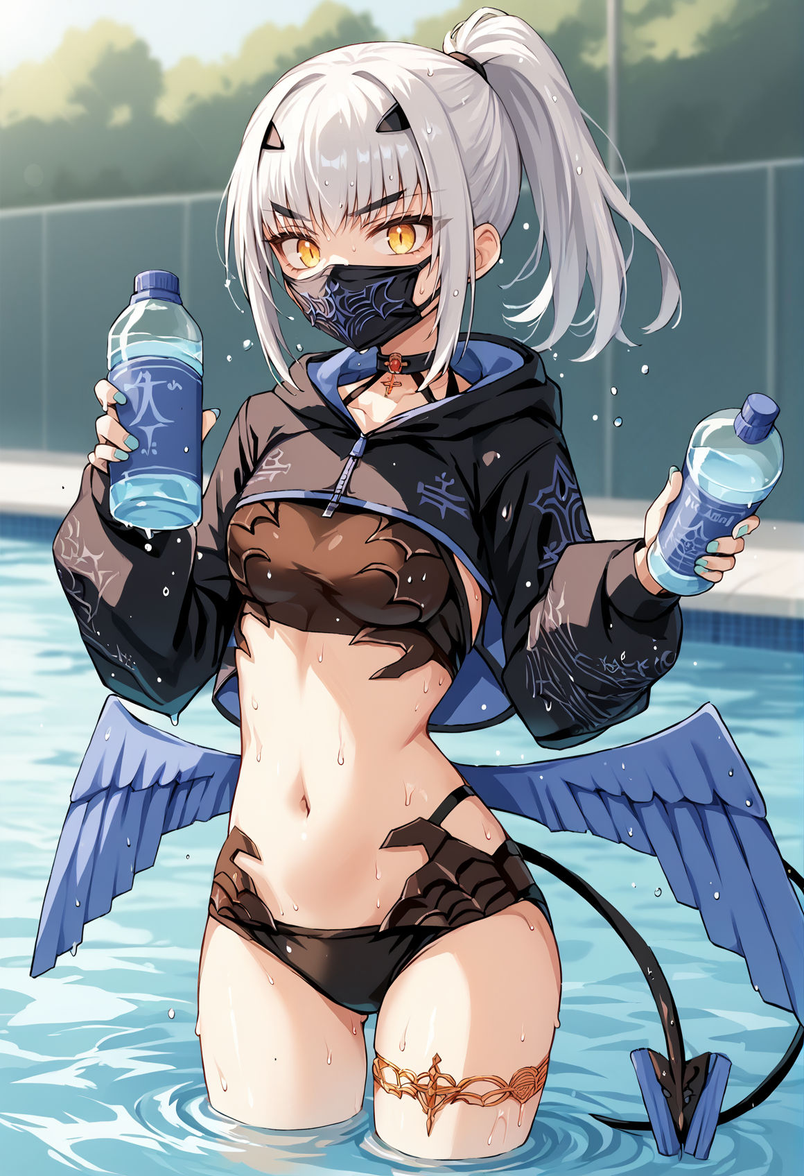 Swimsuit (asc1): black bikini, demon tail, blue wings, ponytail, cropped jacket, MOUTH mask