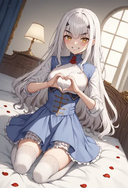 Core tags: forked eyebrows, white hair, long hair, gradient hair, yellow eyes, v-shaped eyebrows,