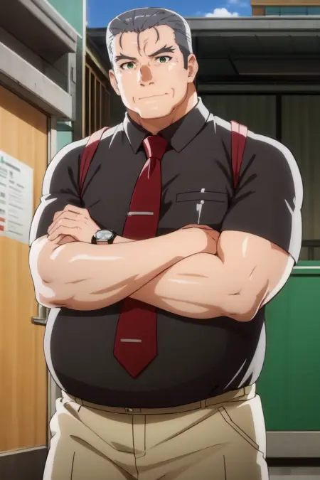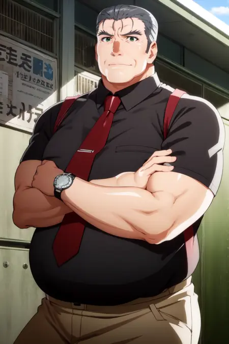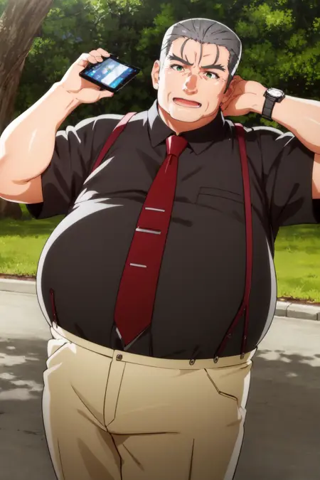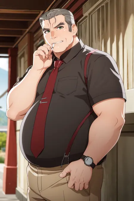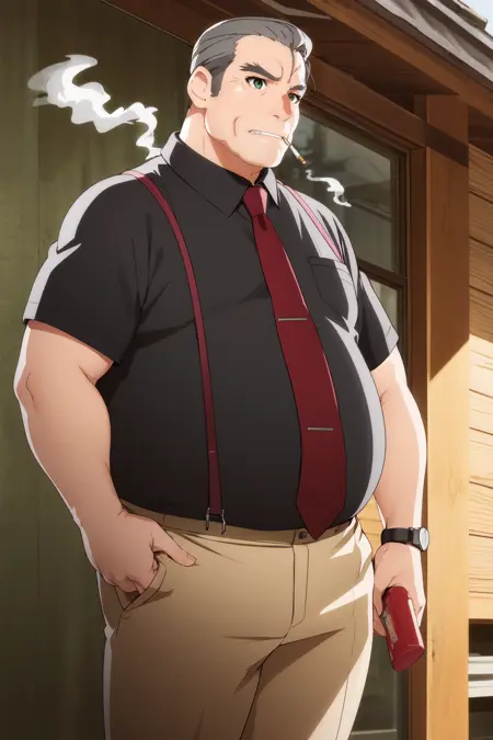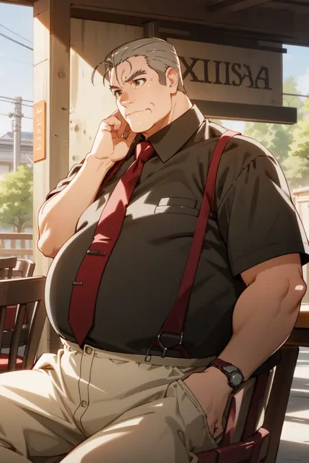 Trigger words: ooishikuraudo (probably unnecessary), fat, plump, old, black shirt, white pants, suspenders, red necktie, wristwatch, grey hair, hair slicked back, green eyes