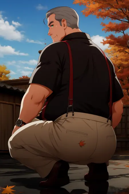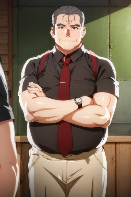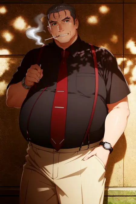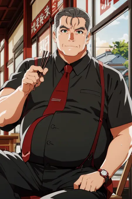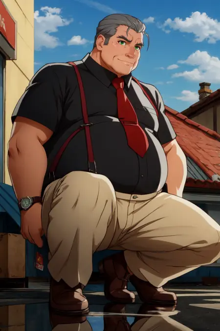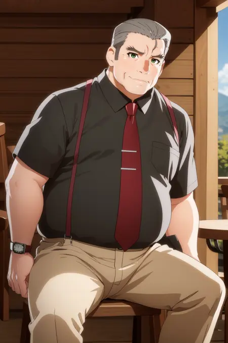 Trigger words: ooishikuraudo (probably unnecessary), fat, plump, old, black shirt, white pants, suspenders, red necktie, wristwatch, grey hair, hair slicked back, green eyes