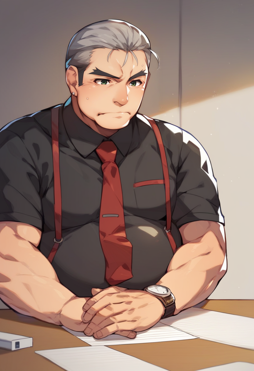 Trigger words: ooishikuraudo (probably unnecessary), fat, plump, old, black shirt, white pants, suspenders, red necktie, wristwatch, grey hair, hair slicked back, green eyes