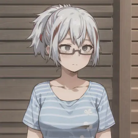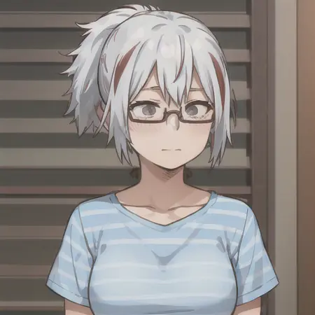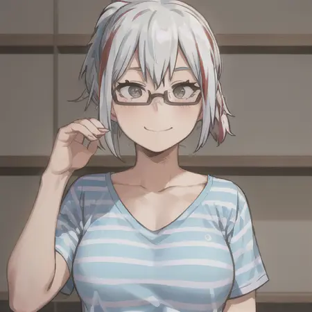 후유미 도도로키, 1걸, 솔로, 가슴, 짧은 머리카락, 셔츠, 겸돌뼈, 상체, 빗자루 머리, 흰 머리카락, 짧은 소매, 빨간 머리카락, 다색 머리카락, 안경, 줄무늬, 날개 모양 머리카락, 회색 눈, 손을 모은 상태, 파란 셔츠, 반프레임 안경, 하프프레임 안경, 줄무늬 셔츠, 웃는 표정