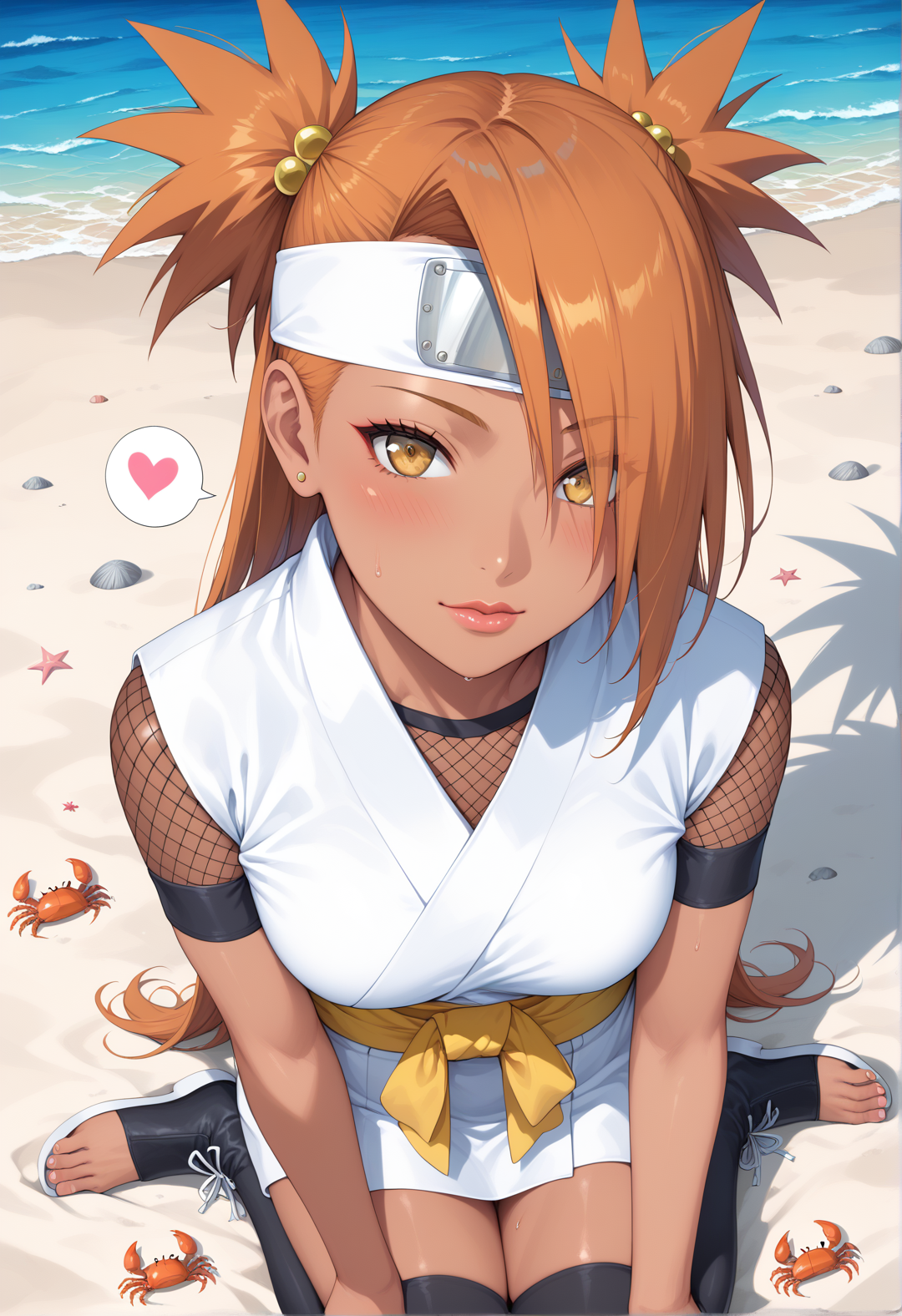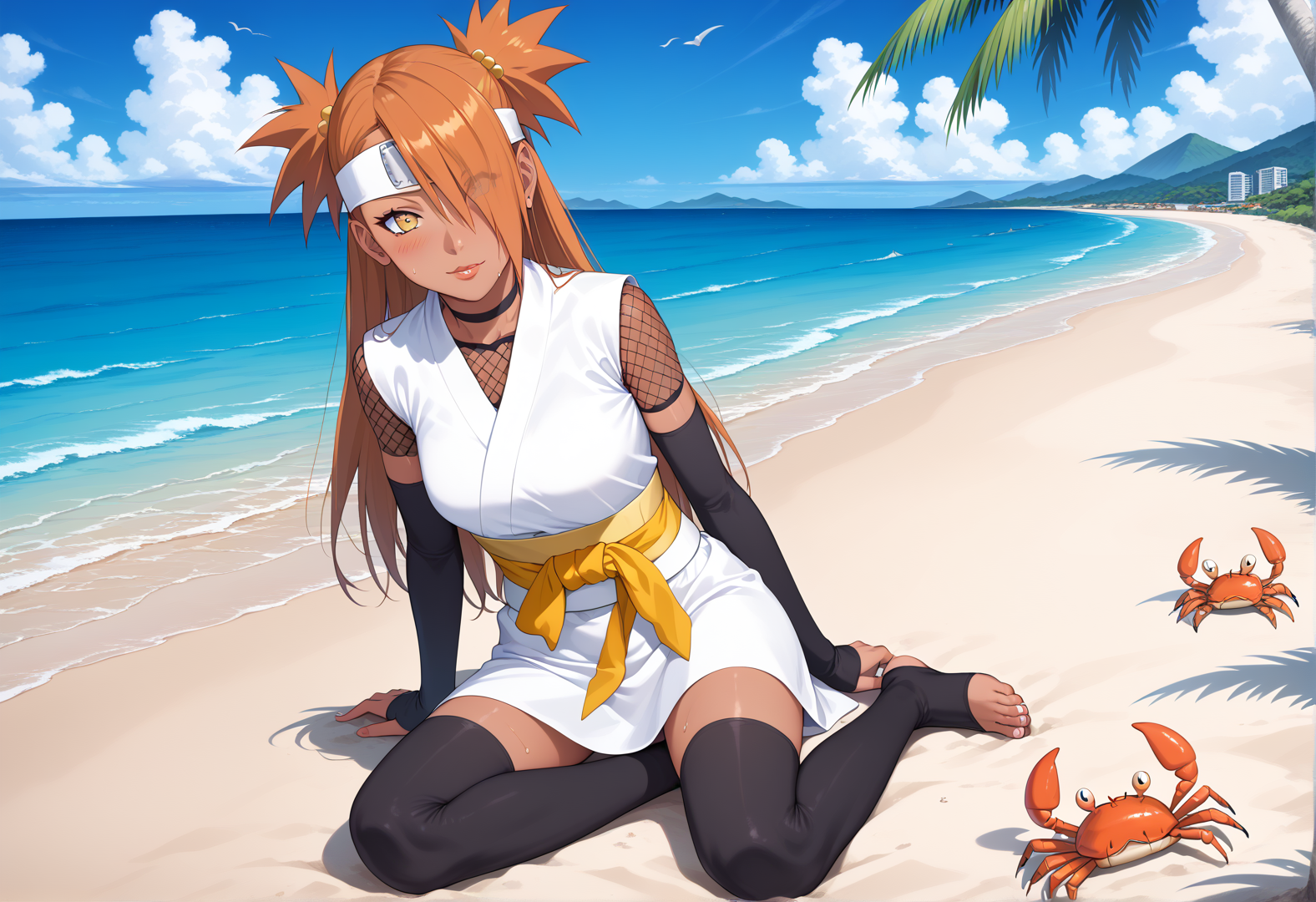 • Default outfit: chodef, forehead protector, white kimono, fishnet shirt, toeless footwear, toes, arm warmers, sleeveless, yellow sash, dark yellow ribbon,