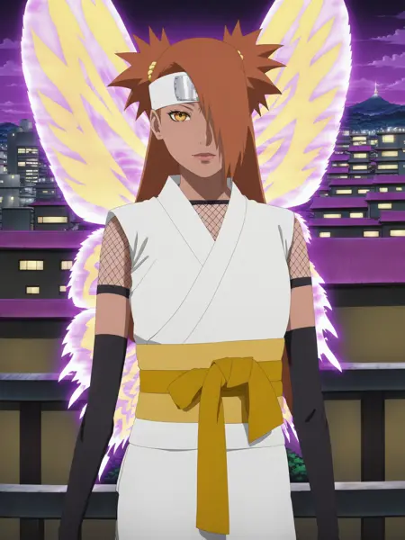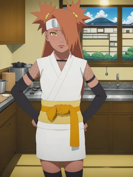 Clothing Prompt: double buns, white sash, orange ribbon, black arm warmers, fishnet, (Note: This should should only be necessary if you are using something other than, "AAM XL (Anime Mix)" by Lykon. Try placing in positive / negative prompt to add or change her drip).