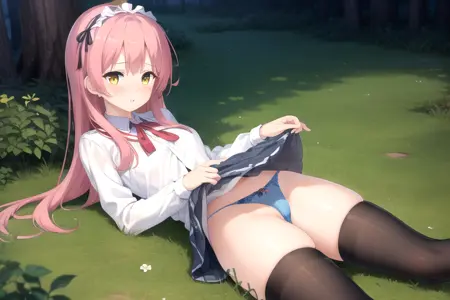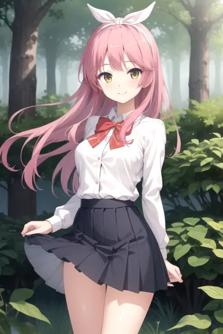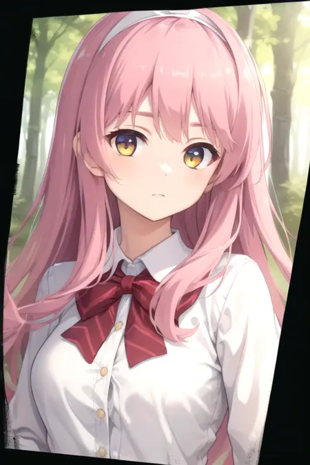 very long hair,pink hair,shiny hair,floating hair,white hairband,hair ribbon,sidelocks,bangs,yellow eyes