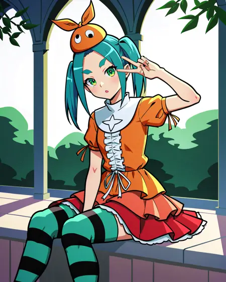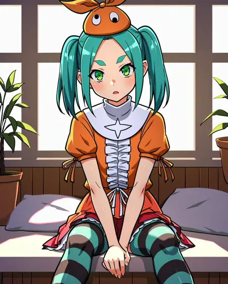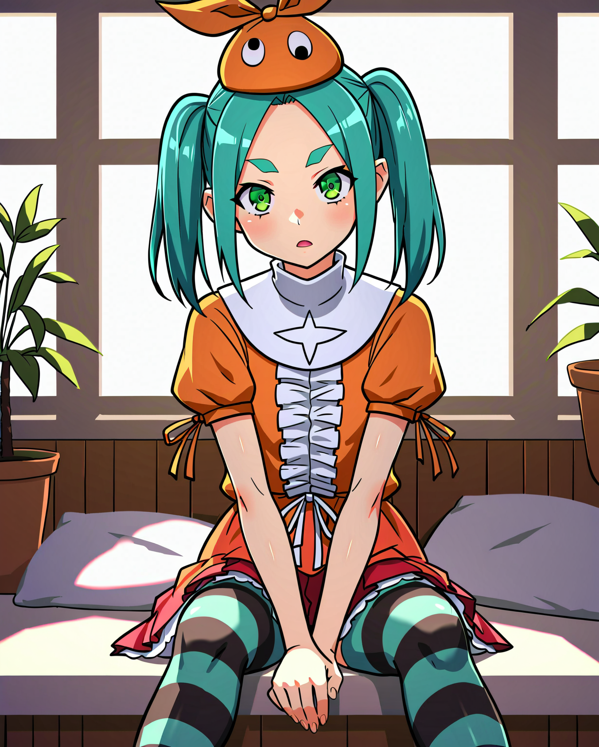 ononoki yotsugi, 1girl, solo, highres, twintails, aqua hair, green eyes, thick eyebrows, orange headwear, orange dress, striped thighhighs, expressionless