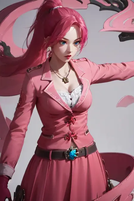 WuFengDonghua, 1girl, solo, blue eyes, skirt, pink dress, cleavage, medium breasts, ponytail, pink hair, red hair, belt, necklace, gloves, long sleeves, buttons,