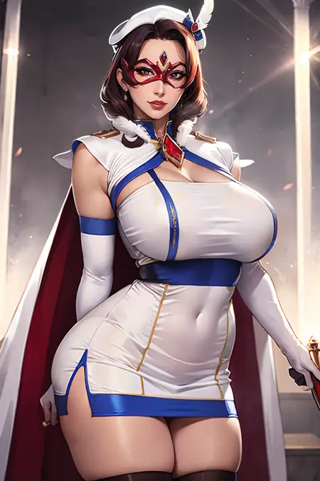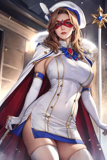1girl, wearing gfonta1ne, [any size you like really] breasts, white dress, fonta1ne_mask, fonta1ne_hat, forehead jewel, jewelry, hat feather, cape, elbow gloves, thighhigh, holding, magical wand, white footwear, knee boots