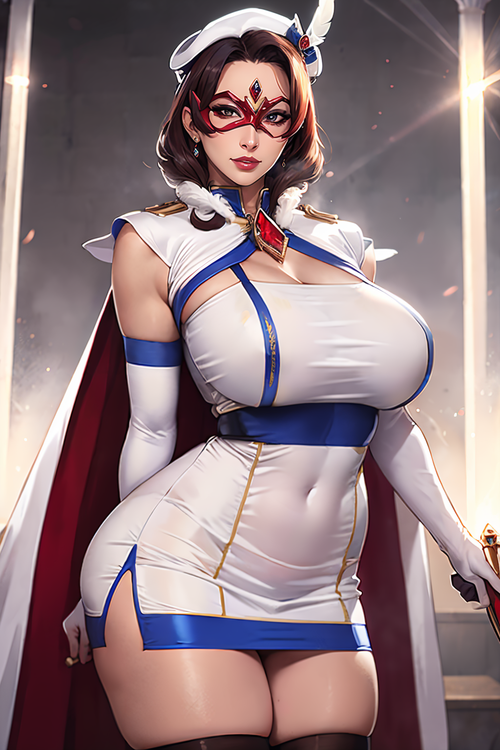 1girl, wearing gfonta1ne, large breasts, white dress, fonta1ne_mask, fonta1ne_hat, forehead jewel, jewelry, hat feather, cape, elbow gloves, thighhigh, holding, magical wand, see-through, panties, open clothes, cleavage