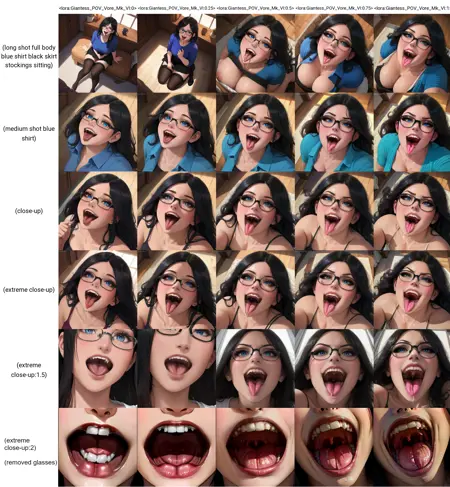 このLoRAの一般的な効果は、キャラクターをやや「捕食者」のように見せることです。わずかに怪物的で、より激しく、直接的に彼女の口の中を覗き込めるように構図を調整します。また、口の内部の描写を改善することもあります。プロンプトに(extreme close-up:2)を指定すると、このLoRAがないとしばしば混乱した結果になる「マウッシュット」画像を生成できます(添付のグリッドをご覧ください)。これらの極端なクローズアップの結果は完璧ではありませんが、LoRAなしで得られる結果よりははるかにましです。私は、このような画像専用の別LoRAの開発を進めています。