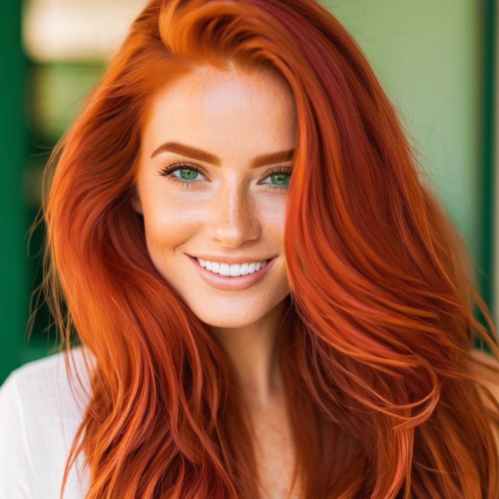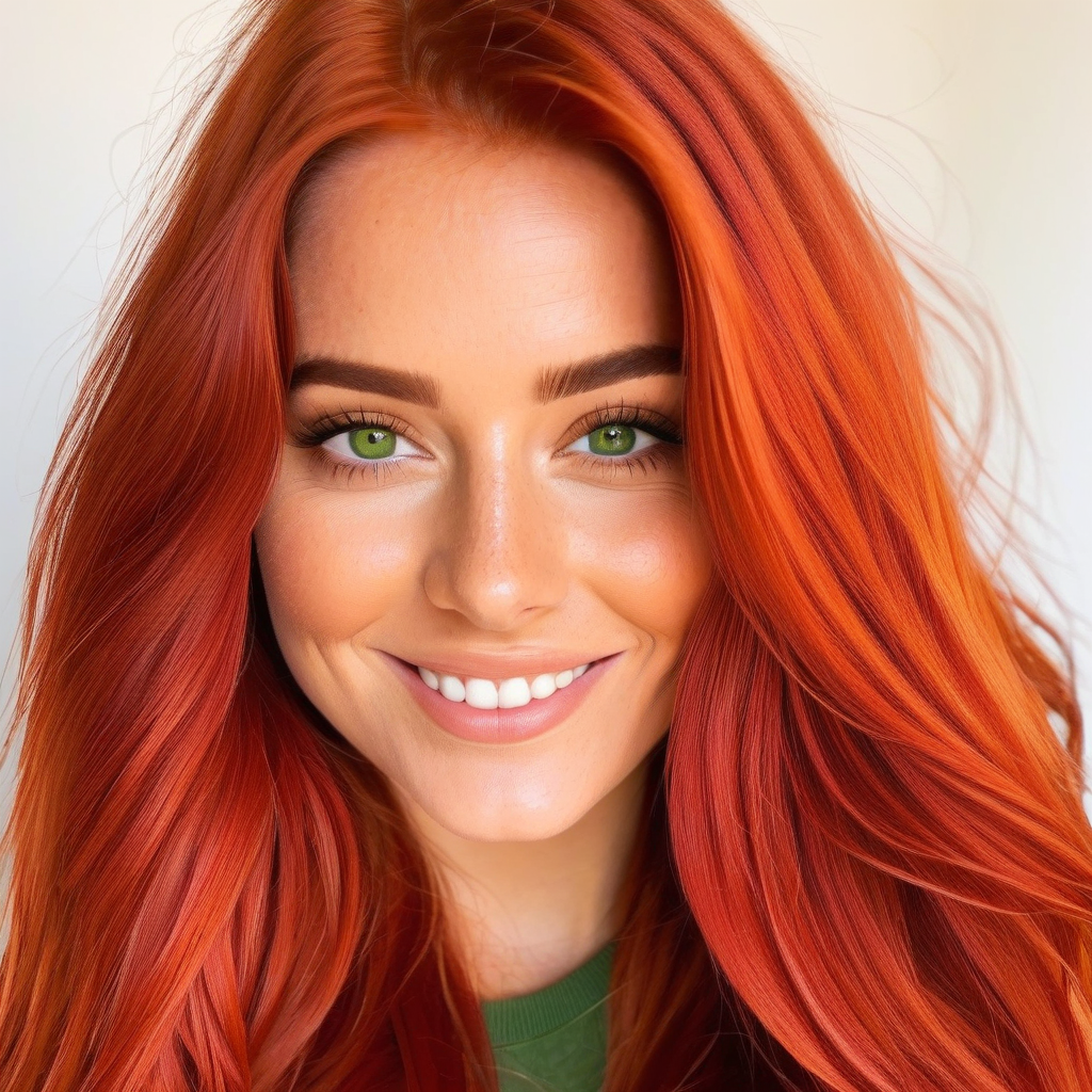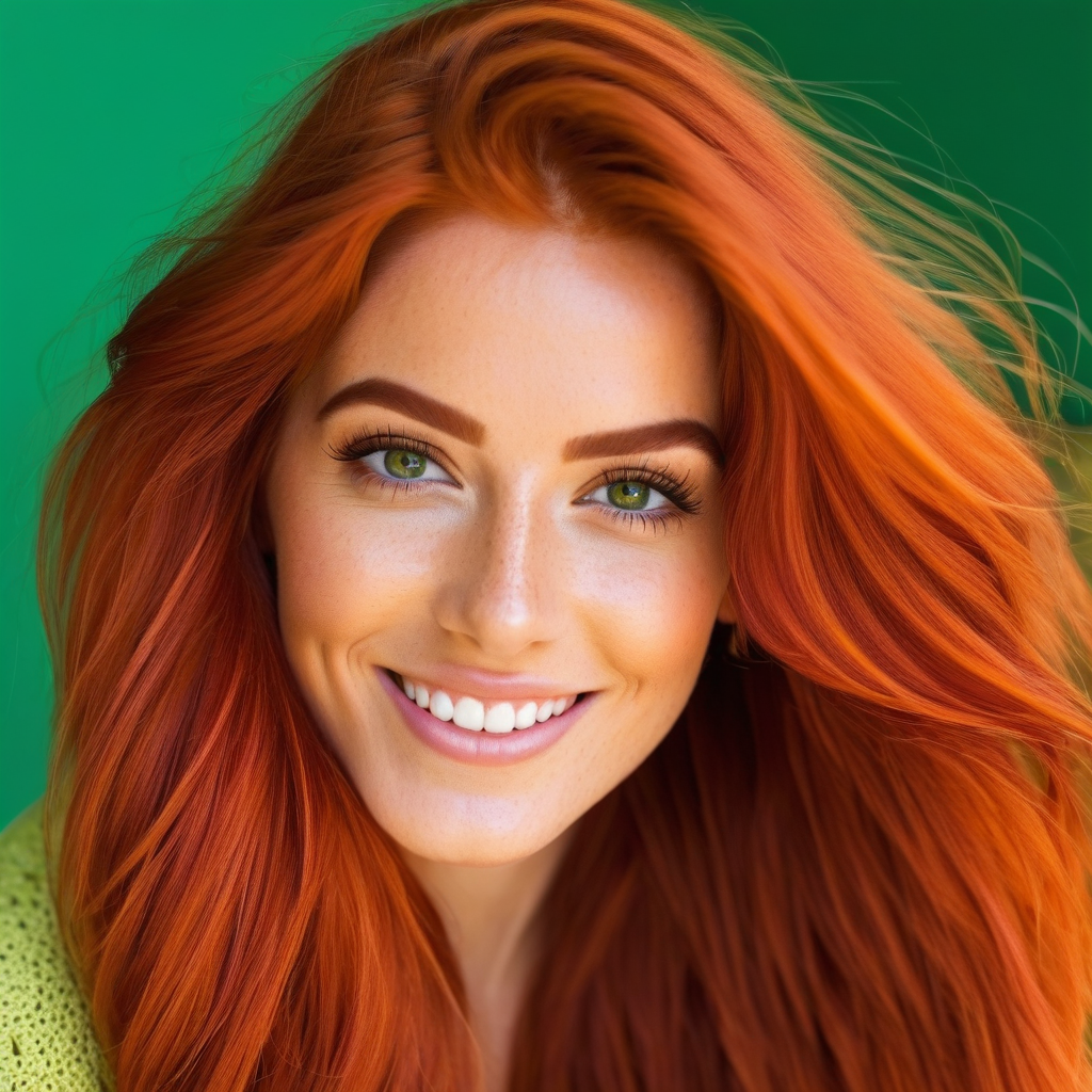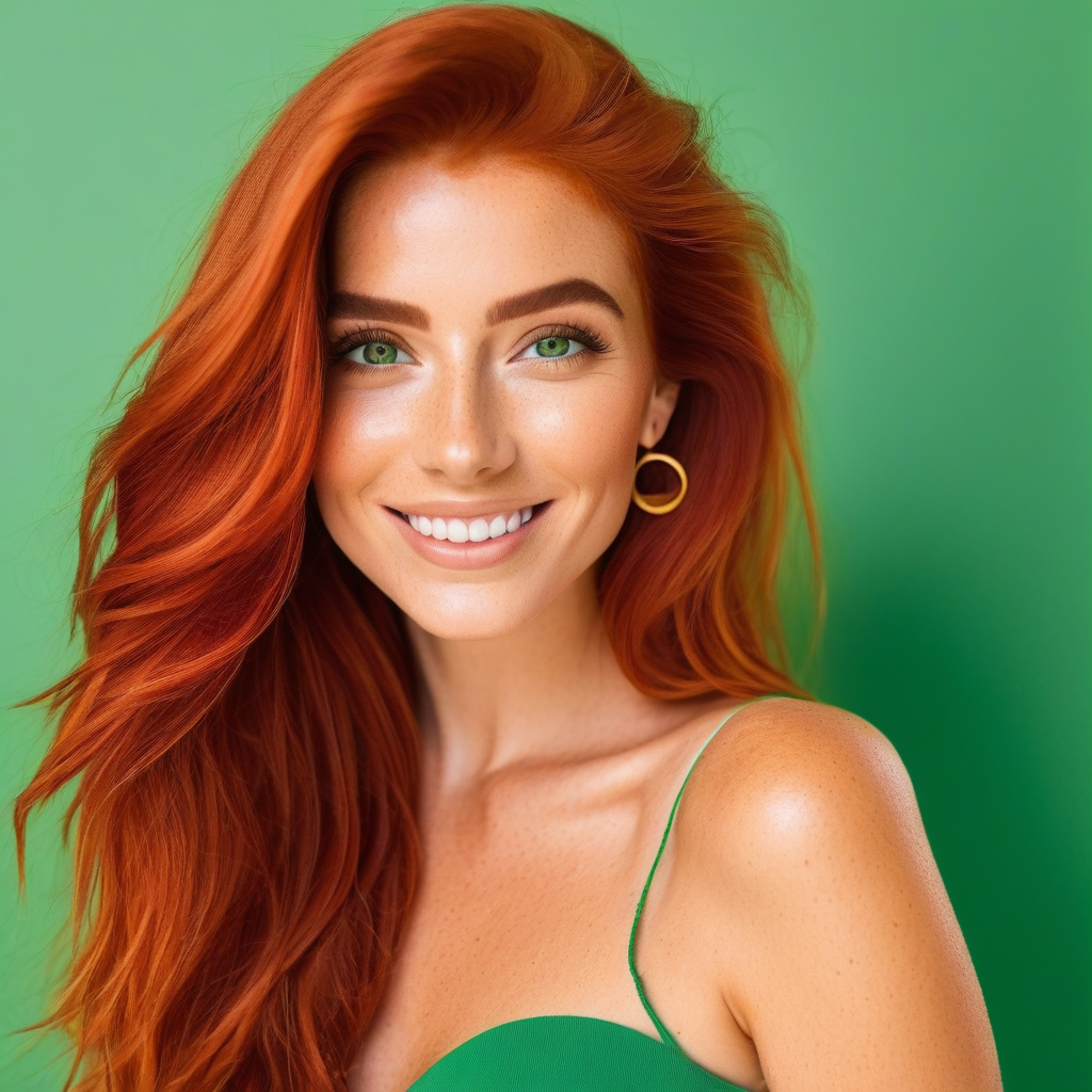 a beautifull woman with ginger hair and green eyes portrait she smiles