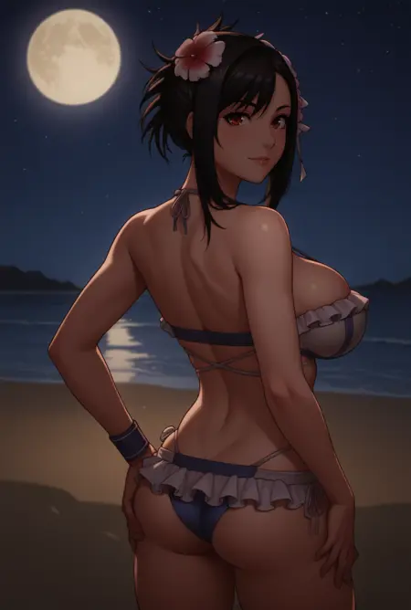 服装1:["tifa_sunshine, 比基尼, 黑发, 红眼, 侧发, 泳装, 荷叶边比基尼, 发饰, 侧系式比基尼下装, 裸露肩膀"]