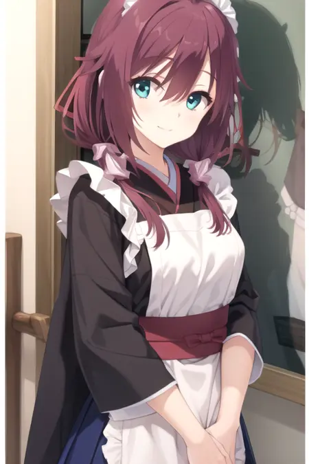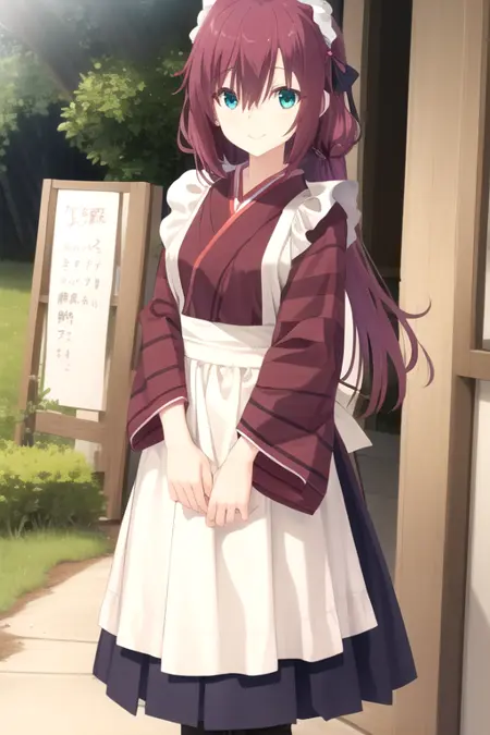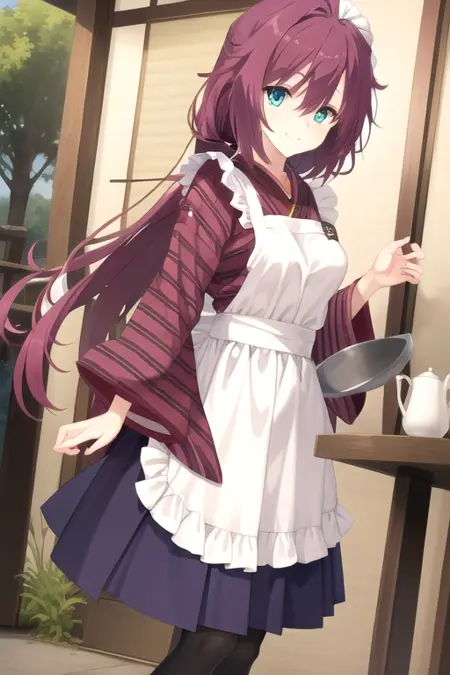 white apron,maid apron,frilled apron,japanese clothes,red kimono,striped kimono,long sleeves,wide sleeves,large breasts,long skirt,hakama skirt,blue skirt,black pantyhose,brown footwear,boots