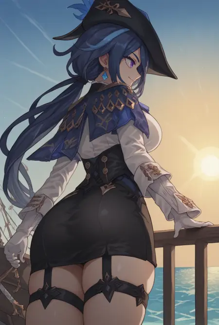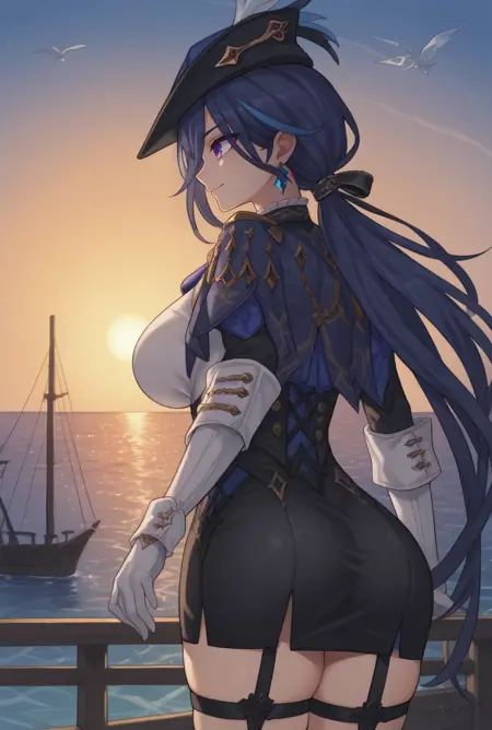 Outfit 1: ["clrnde, streaked hair, ponytail, low ponytail, purple eyes, blue hair, bangs, hat, jewelry, earrings, white shirt, white gloves, long sleeves, black skirt, wrist cuffs, epaulettes, black pantyhose, thigh strap, button gap, garter straps, underbust"]