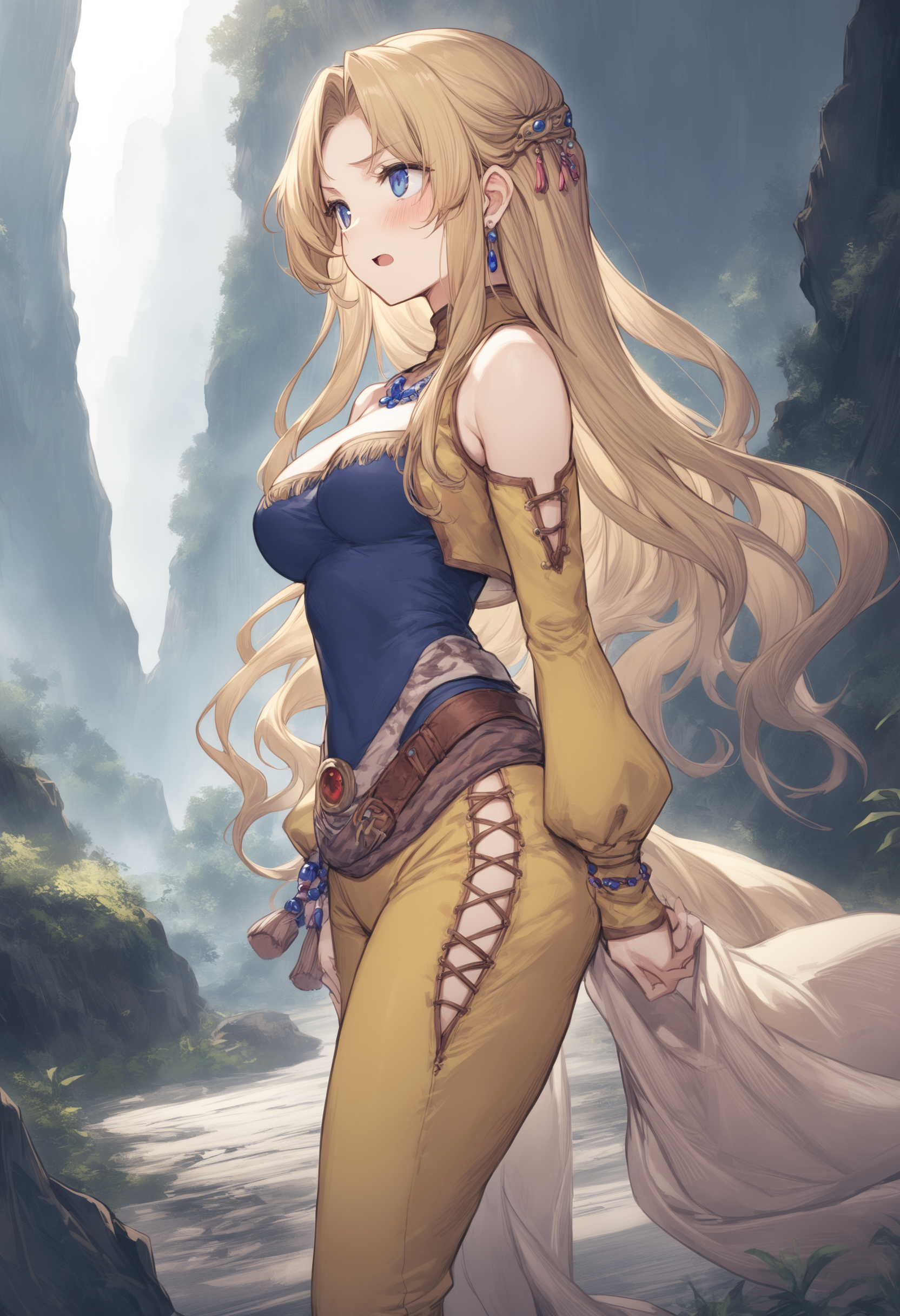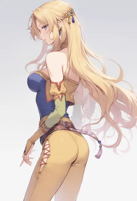 공개된 디자인 화에서 어깨가 드러나는지 여부 등 복장에 차이가 있으므로 정답은 없다고 생각합니다. 하지만 디시디아 파이널 판타지 시리즈에 등장했을 때의 복장을 재현하고 싶다면, blonde hair, blue eyes, hair ornament, large breasts, detached sleeves, bare shoulders, very long hair, wavy hair, vest, yellow pants, belt, jewelry, fringe trim, tassel, cropped jacket, long sleeves, bodysuit, clothing cutout, shoulder cutout, blue leotard, strapless를 포함해 주세요.