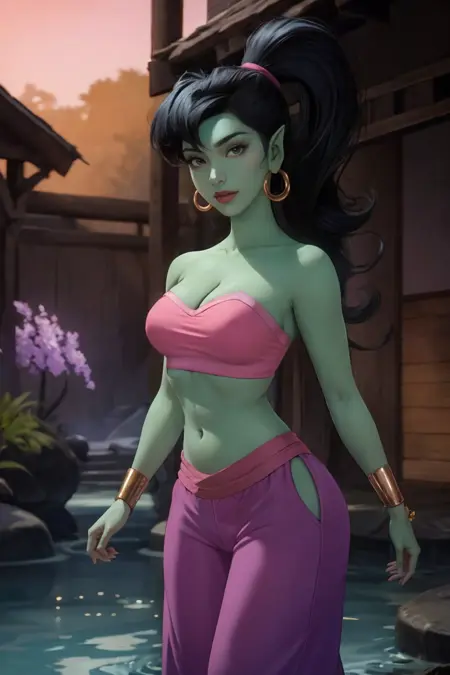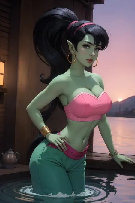 ((green skin)), colored skin, black hair, pointy ears, long hair, ponytail, hoop earrings, breasts, makeup, lipstick, red lips, big hair, very long hair, medium breasts, large breasts, narrow waist, curvy, tall female, high ponytail, hairband, bracelet,