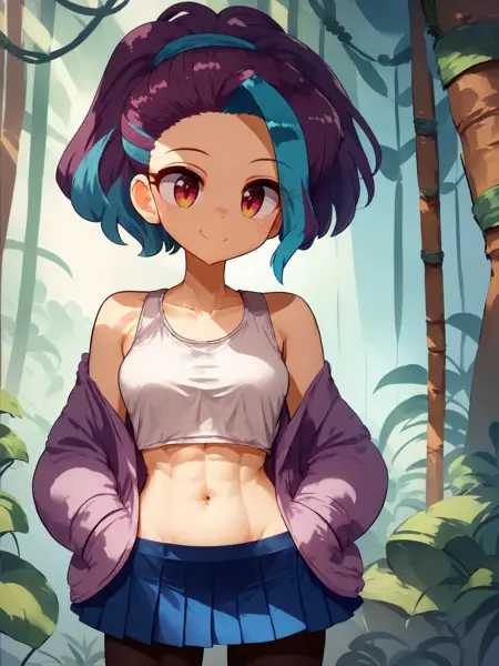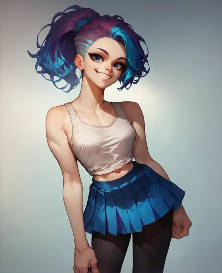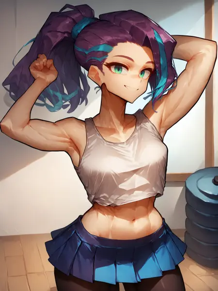 Here are some relevant tags: ascella, tank top, leggings, skirt, ponytail, messy hair